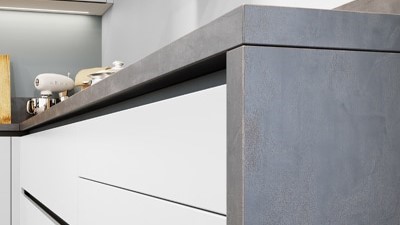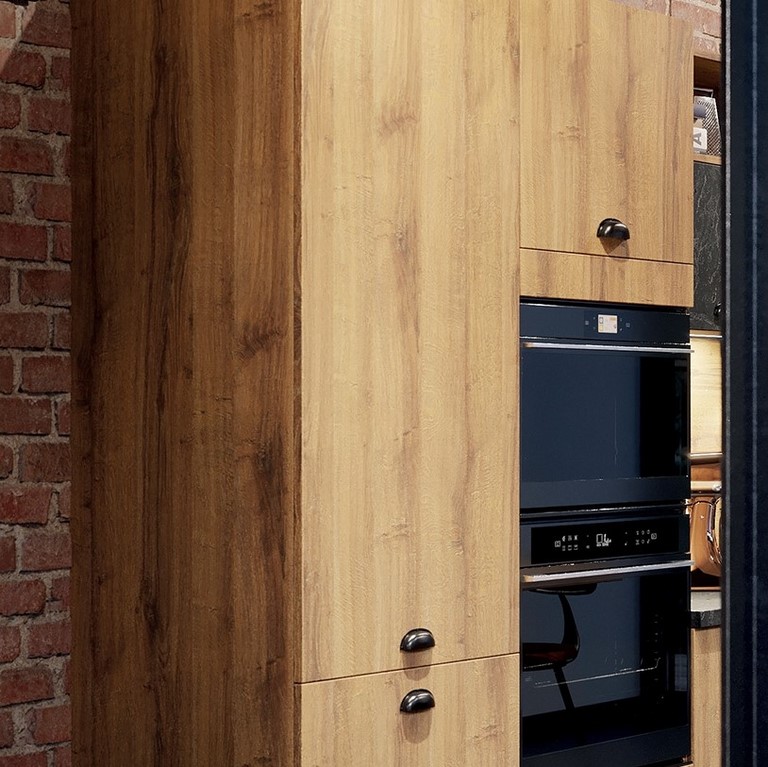 Associez la chaleur de la façade Chêne Cognac (structure profonde) à la texture plus froide de la finition Ardoise noire. Un total look industriel noir et bois !